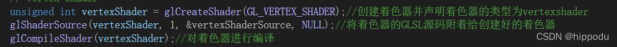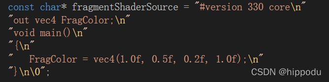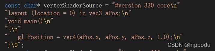 char* vertexShaderSource引号内的内容即为GLSL编写的顶点着色器源代码。