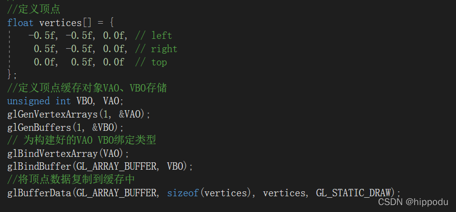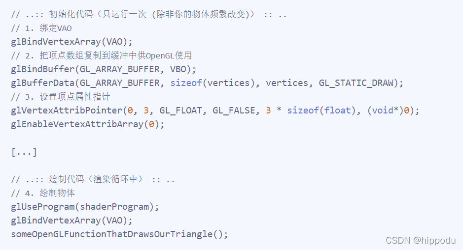 整体的流程大致是:创建VAO\VBO,绑定VAO VBO,输入顶点数据,配置顶点数据设置顶点属性指针,在渲染循环中绘制。