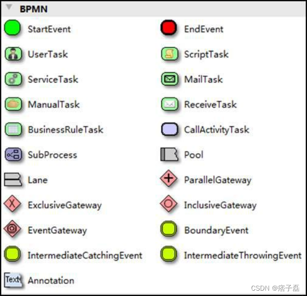 BPMN 是目前被各 BPM 厂商广泛接受的 BPM 标准。Activiti 就是使用 BPMN 2.0 进行流程建模、流程执行管理,它包括很多的建模符号,比如: