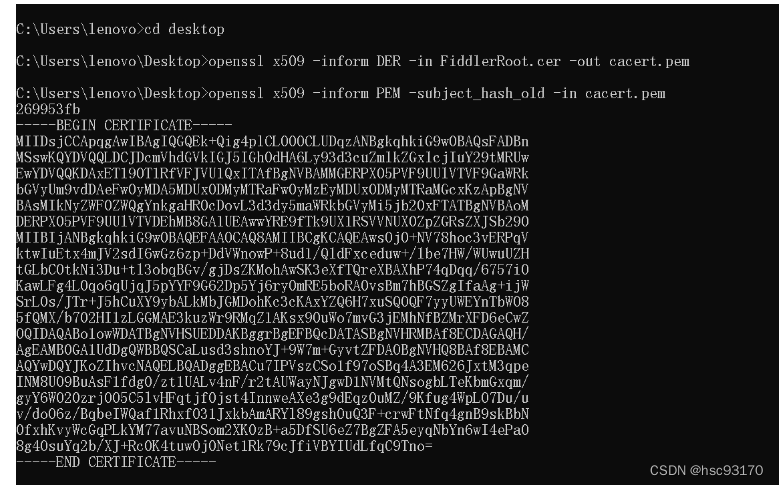 openssl x509 -inform DER -in FiddlerRoot.cer -out cacert.pem