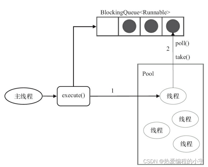 线程从任务队列中获取任务然后执行:这个线程执行完上图中1的任务后,会反复从BlockingQueue获取任务来执行