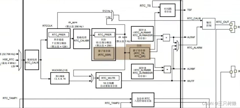 (RTCCLOCK/(127+1)产生ck_apre时钟,ck_apre时钟再经过同步分频产生ck_spre时钟。影子寄存器亚秒是默认值分之一)