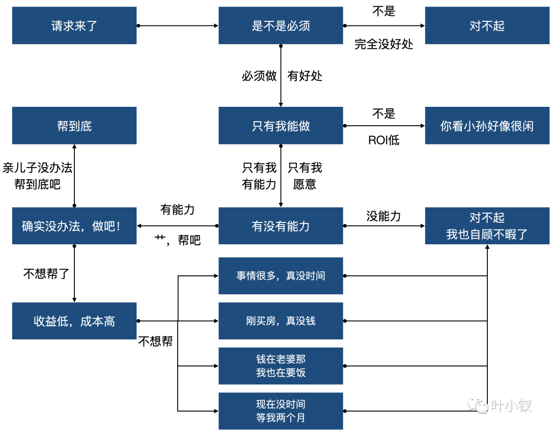 除非必要,不能因为你的拒绝而造成人际关系紧张,因为光是处理老婆的埋怨这种事,都可以消耗巨大体力,如果人际关系差了,就会每天被各种破事、烂人纠缠,得不偿失,所以这里需要脑力加入,比如拒绝这个事,面临一个求助(请求),首先要做一个判断: