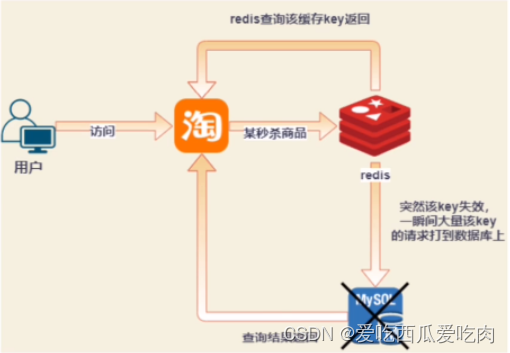 用户请求查询一个数据时redis如果没有,直接去请求MySQL,当很多用户同时请求并且都没命中就会都去请求数据库,此时会给数据库带来非常大的压力