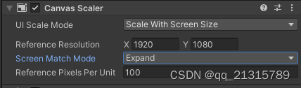 下面的Screen Match Mode选项有三个选项:匹配宽和高、扩展、收缩。分别解释: