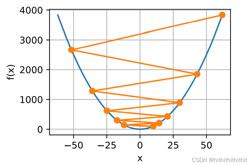 由上图可知,起始点在右上角的那个点,沿着梯度下降的方向进行着优化,最终达到了函数的极小值点,在凸函数中,同样这也是函数的最小值点,也就是一个最优解。下面是两个不同学习率的优化解。