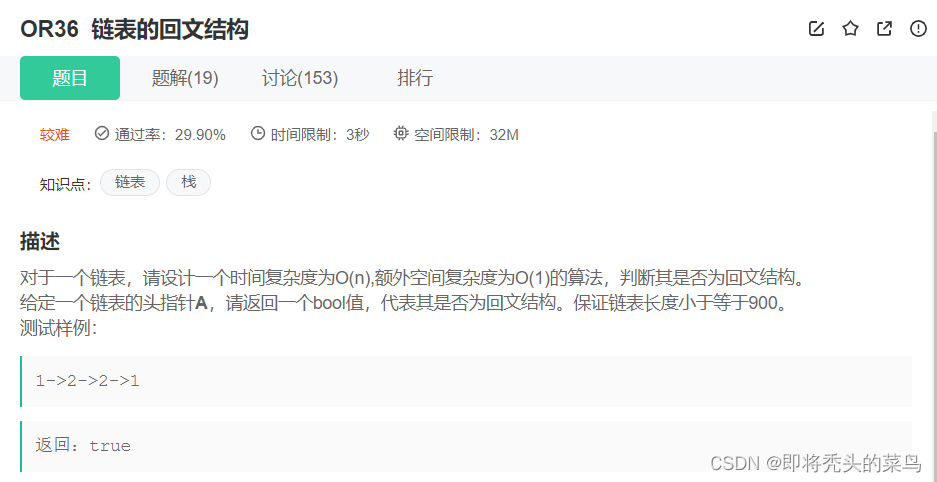 - .分别从链表头尾两端开始比较,如果遇到val值不一样的情况,则不是回文,否则是回文。