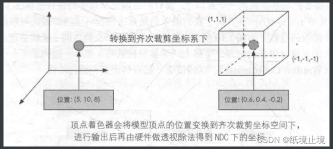 图上给出的坐标范围是 OpenGL 同时也是 Unity 使用的 NDC,它的 z 分量范围在[-1, 1] 之间,而在 DirectX 中,NDC的 z 分量范围是 [0,1]。也就是只有半个立方体。