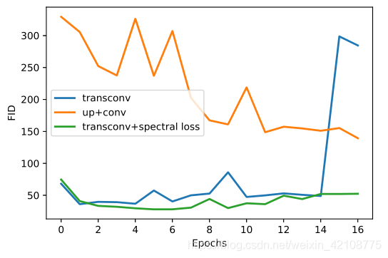 图13和图14显示了使用带有不同上卷积单位和具有频谱损失的相应版本的baselineGAN实施方式,FID随着epoch的变化。这些结果在FID度量方面显示出明显的积极作用,其中频谱正则化使整个训练过程稳定且低FID,而未规整的GAN往往会“崩溃”。图12可视化了高FID值与失败的GAN图像生成之间的相关性。