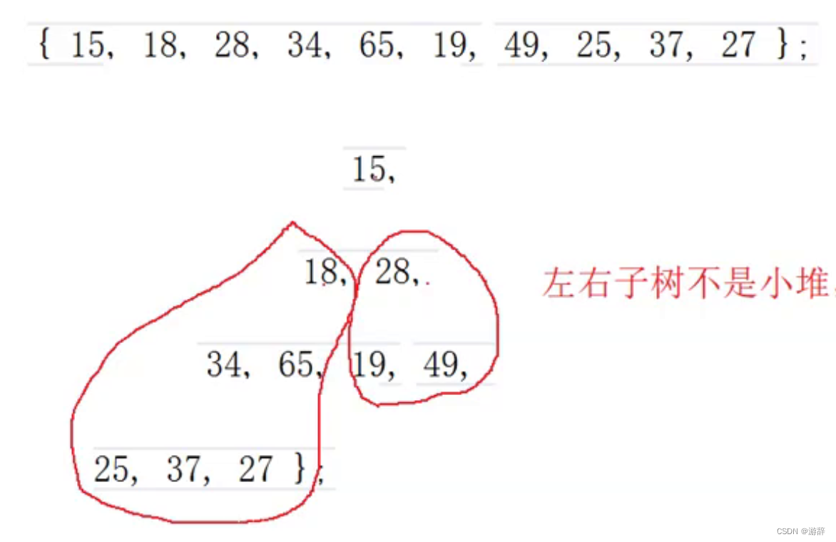 - 满足以上特点后,如何调成小堆呢 --> 向下调整算法