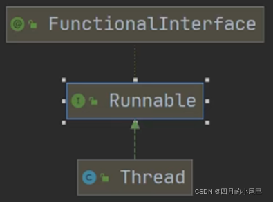 }和第一种方法一样,还是在run方法中写业务代码,写好后在main方法中创建对象dog,此时不能用dog调用start方法实现线程,因为Runnable接口中没有start方法