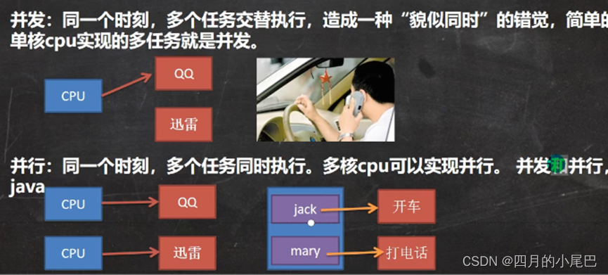 同一个时刻,多个任务交替执行,(cpu交替执行切换速度很快,所以)造成一种“貌似同时”的错觉,简单来说,单核cpu(只有一个的意思)实现的多任务就是并发